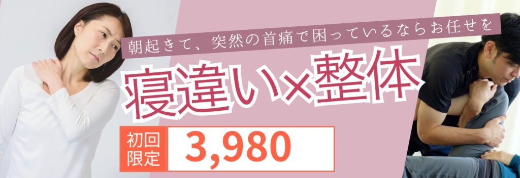寝違いとは、寝ている間の姿勢や体の緊張が影響し、首や肩まわりの筋肉・関節に負担がかかることで、朝起きたときに突然痛みが出る状態をいいます。