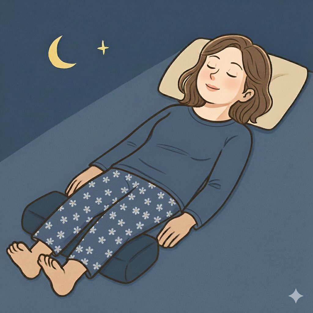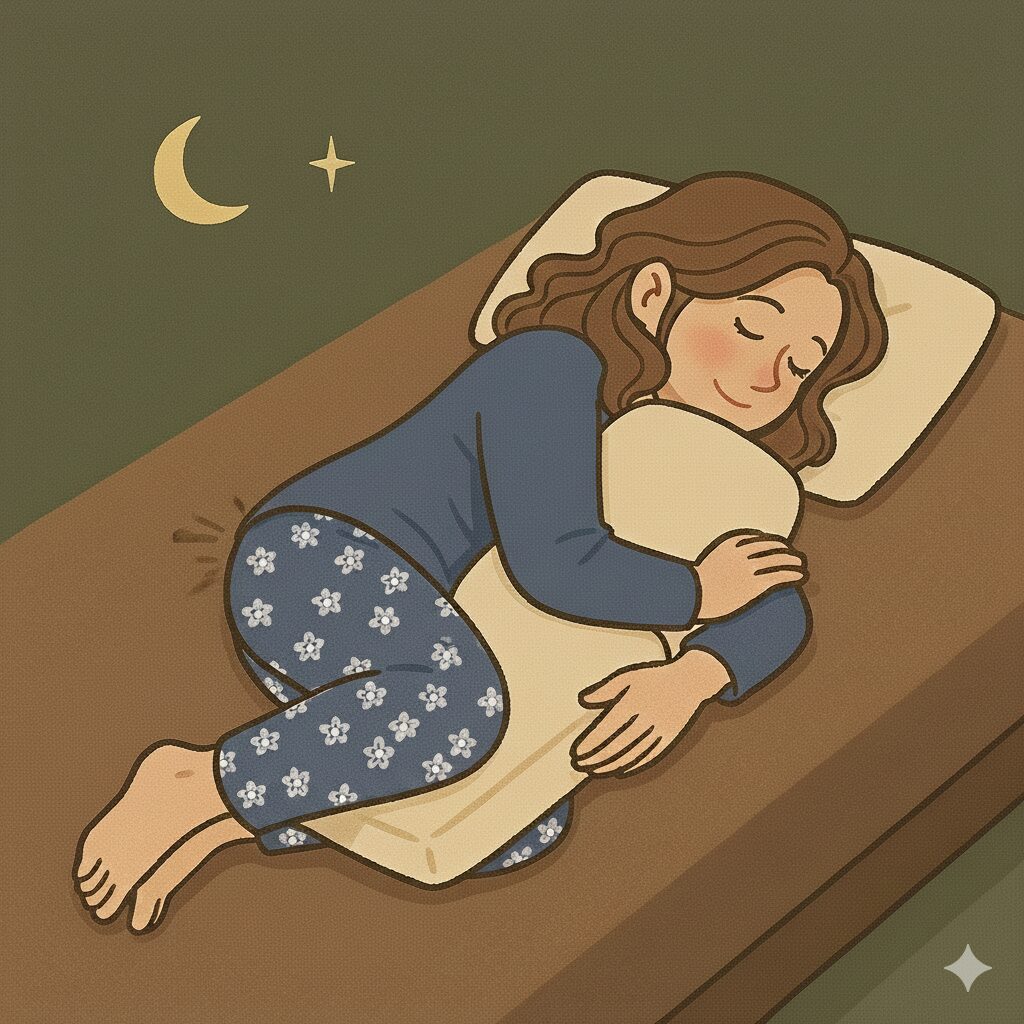 - 横向きで寝て両膝を軽く曲げ、膝の間にクッションを挟む