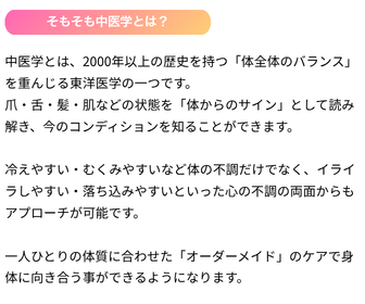 自身に適した、日々の生活や食事のコツ(薬膳)などのパーソナルなアドバイスをうけることができます。